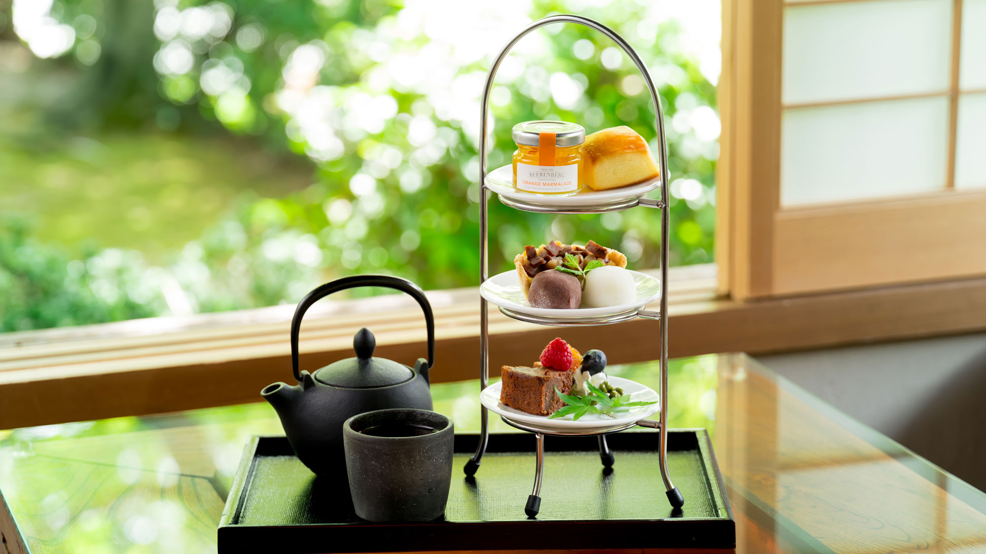 嵐山の絶景を愛でる特等席とお茶菓子や軽食で、くつろぎの時間をご提供いたします。