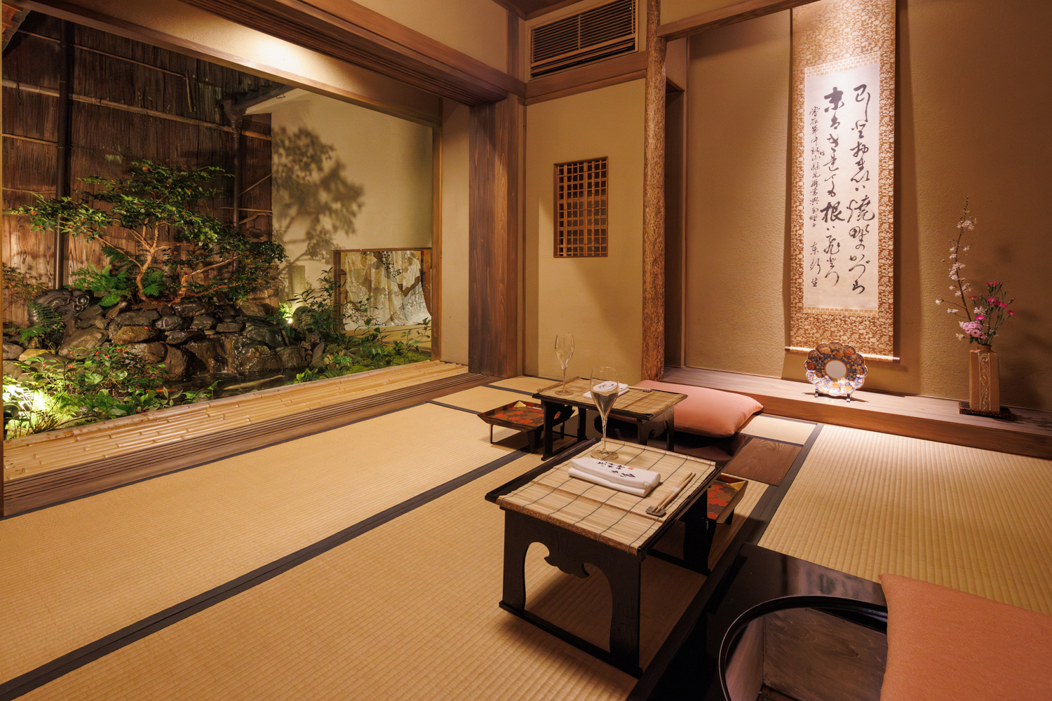 町屋風の造りと窓外に広がる日本庭園、鴨川に面した納涼床は京都ならではの落ち着いた雰囲気を醸し出し、浮世をひととき離れて幕末の世界へ誘います。建物は土佐勤王党の盟主であった幕末の志士、武市半平太の寓居跡を料亭としたもので、改装は施してありますが床柱と床板は当時のまま。宿泊のお客様には檜風呂をご用意し、宴会等に和室カウンターのあるお部屋を貸し切りでご利用いただくこともできます。お料理には契約農家で育てた無農薬の伝統的な京野菜を使用しています。季節ごとの旬の味をお楽しみください。