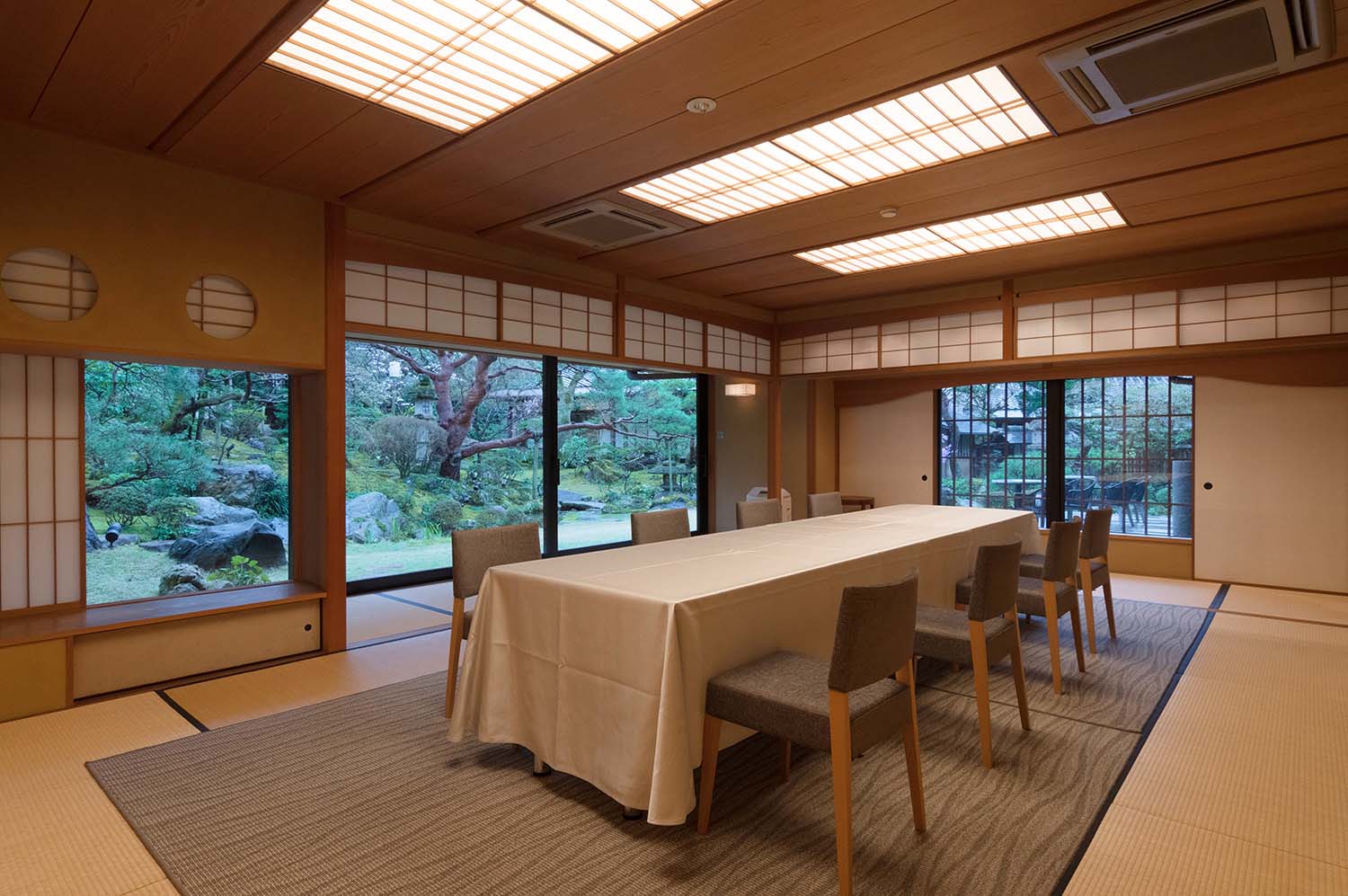 伝統的な数寄屋造りの店内からは約830坪もの広大な池泉回遊式庭園が眺められ、高級感のある大人の雰囲気です。各種懐石料理やフルコース、記念日用のメニューなどを多数ご用意。四季折々で姿を変える庭園の景色を眺めながら、大切な方と特別なひと時をお過ごし下さい。