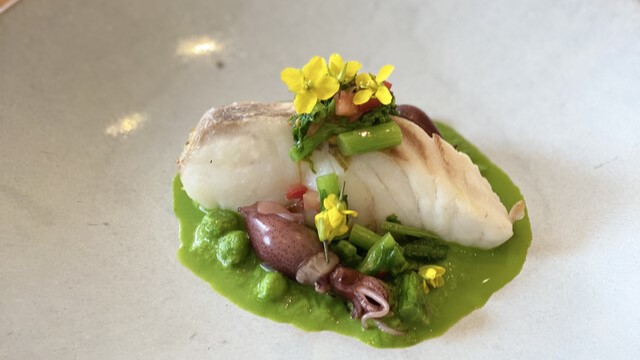 外の明るい光が差し込む店内には、解放感あるオープンキッチンを囲むカウンター席があります。大きな窓から見える景色で季節を感じながら、福岡を中心としたお野菜とお魚を楽しむことができます。長崎県対馬ジビエやヨーロッパの高級食材を使い、季節ごとに組み立てられたお料理の数々をご提供。素材のおいしさを引き立てるソースにもこだわっています。シェフのこだわりがつまったシンプルかつ奥深いお料理をお楽しみください。