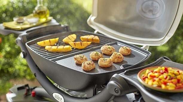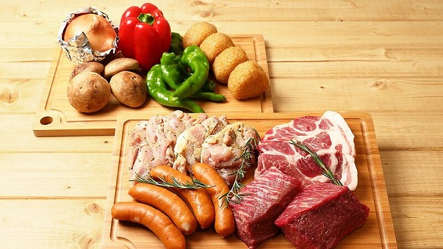 青空の下の開放的なウッドテラスで、お肉や海鮮を使ったバーベキュー