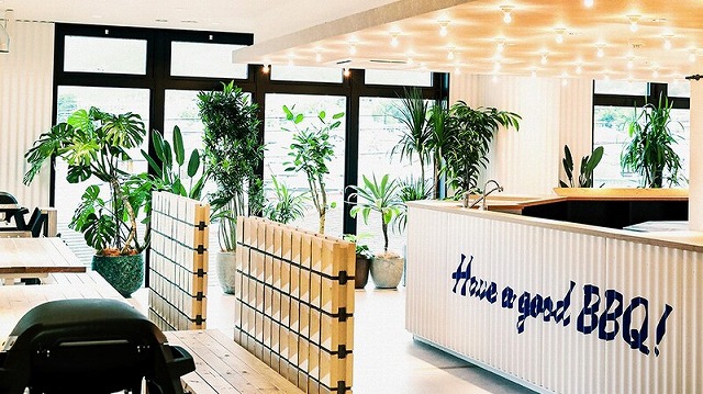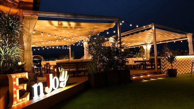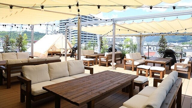 青空の下でバーベキュー。遠くの山まで眺められるテラスに、ウッドデッキと白いソファーを備え付け、開放的な空間となっております。また、白を基調にしたウッドテーブル席もございます。コースではたっぷり2時間~3時間、のんびりとバーベキューをお楽しみいただけます。食材にはUSプライムビーフやスパイスチキンなど、豪華なお肉をご用意。海鮮や丸ごと野菜など、多種多様な食材もございます。1階新鮮激安市場!で購入頂いた食材もこちらでお召し上がり可能です。