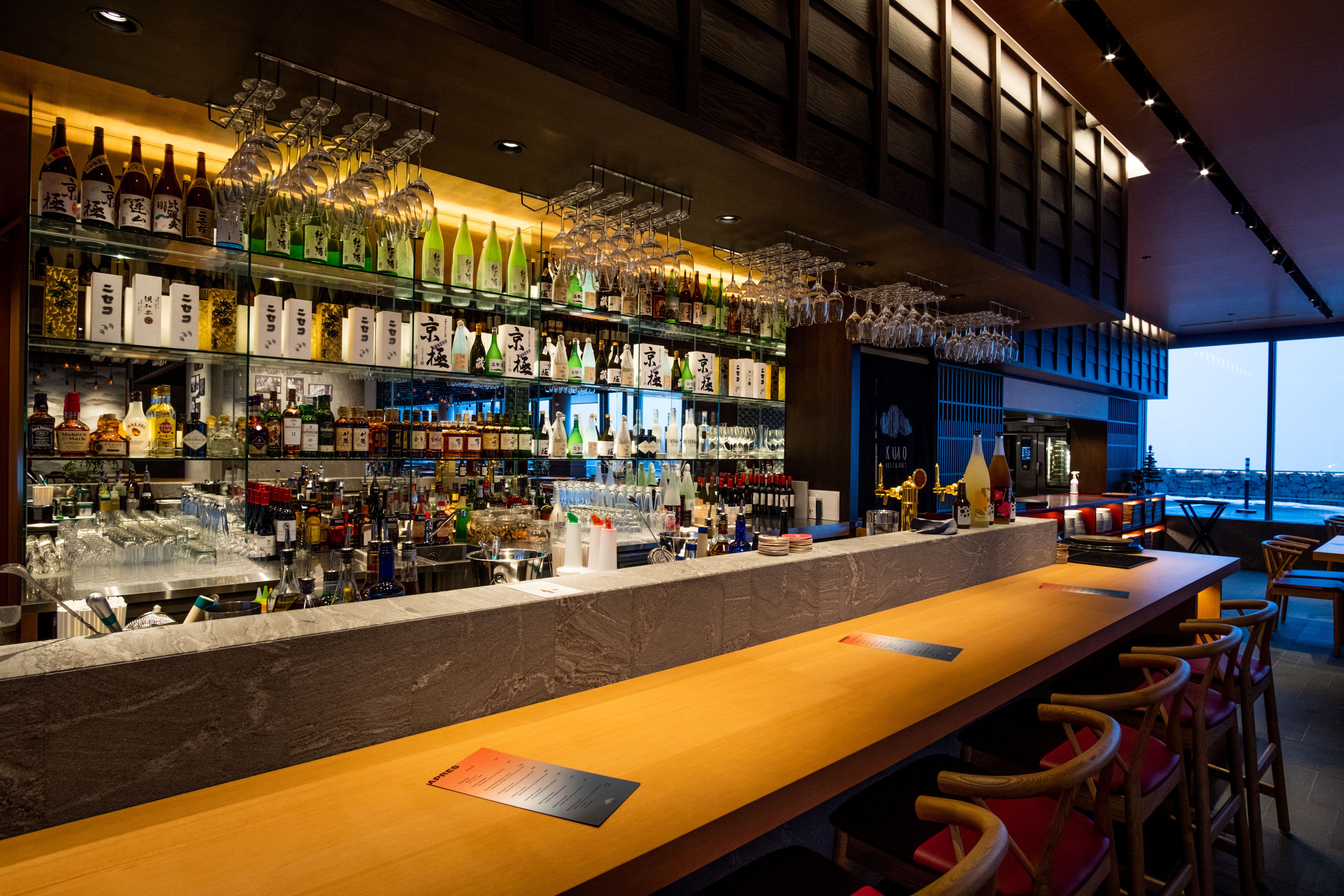 ぶらさがったいくつもの電球、和を意識した内装など、空間としても楽しめるレストラン「KUMO」はスカイニセコ内のメインダイニングです。世界で腕を鳴らしたシェフたちが作る料理には、和風をベースにうまくアレンジされた新しいスタイルの居酒屋メニューが並びます。北海道の食材をメインとした料理に合うクラフトビールをはじめ地酒やワインなど世界中からセレクトしたラインナップもお楽しみいただけます。