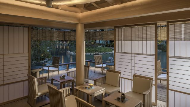 「楓樹」は、京都の美しい景観を堪能できるラウンジです。内装は、伝統的な日本の美を感じさせる和の要素とモダンなデザインが融合し、落ち着いた雰囲気を演出。大きな窓からは、四季折々の景色を楽しむことができ、外の庭園と調和した空間が広がります。静寂の中で、贅沢なひとときを過ごせる場所です。