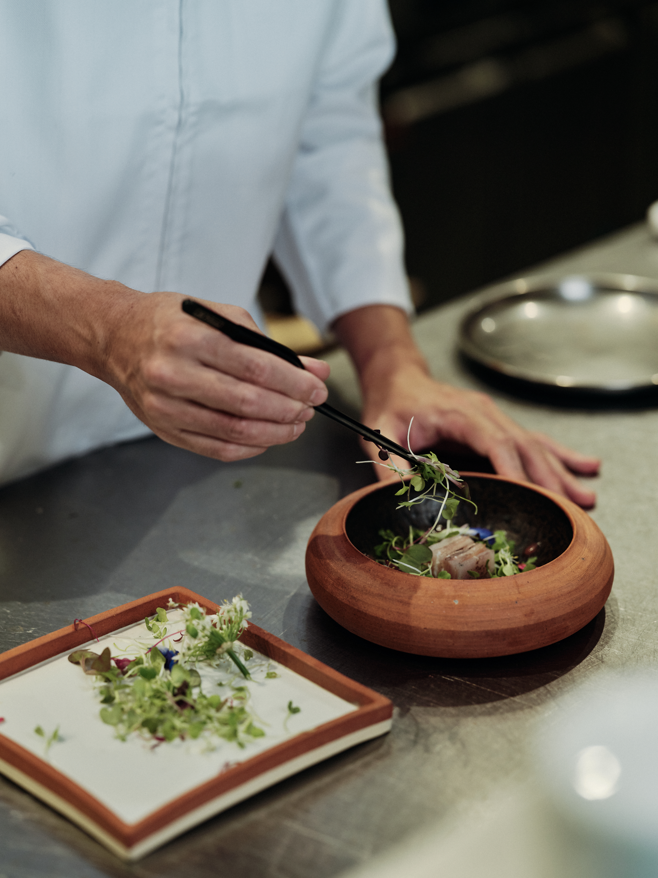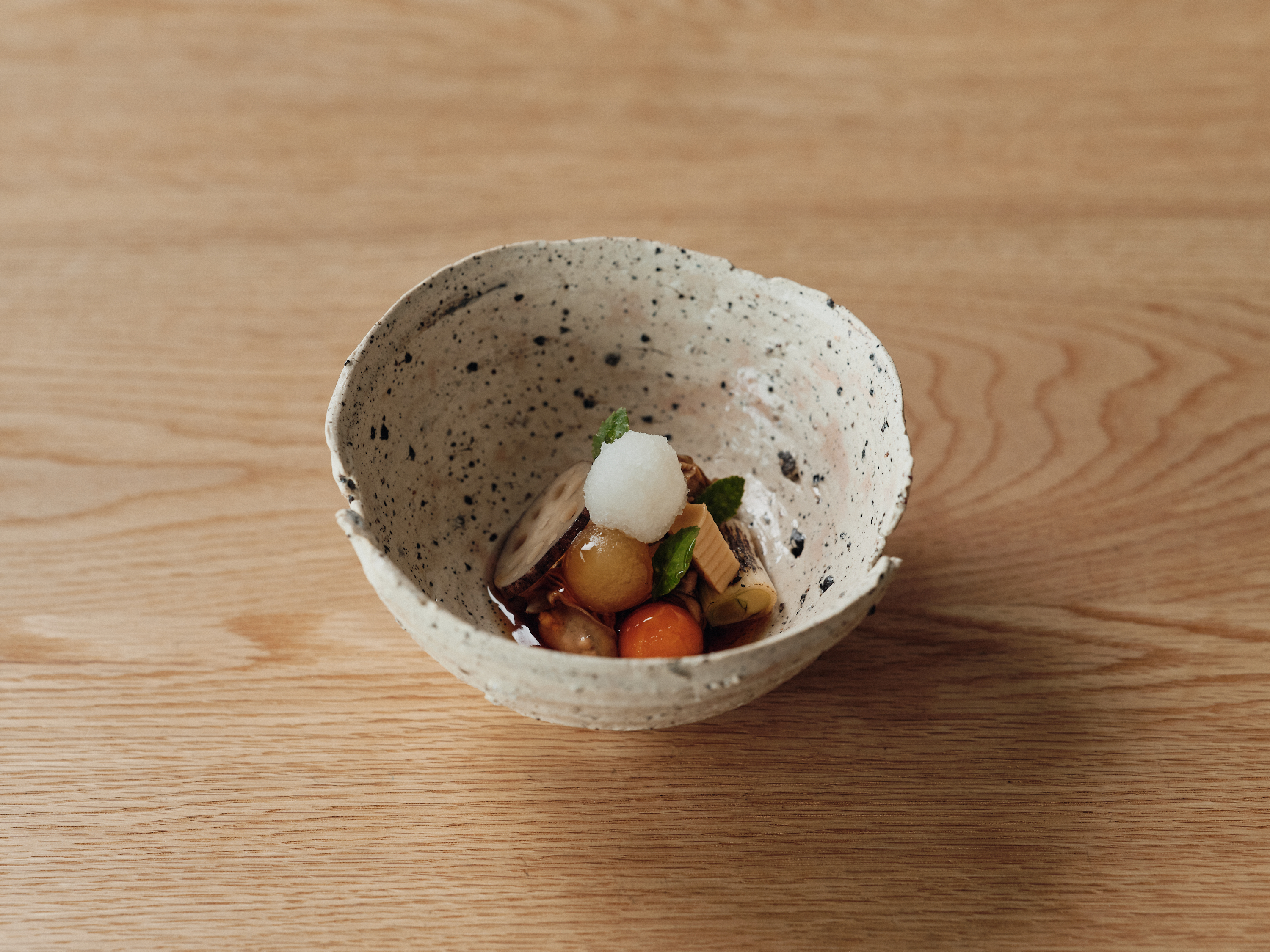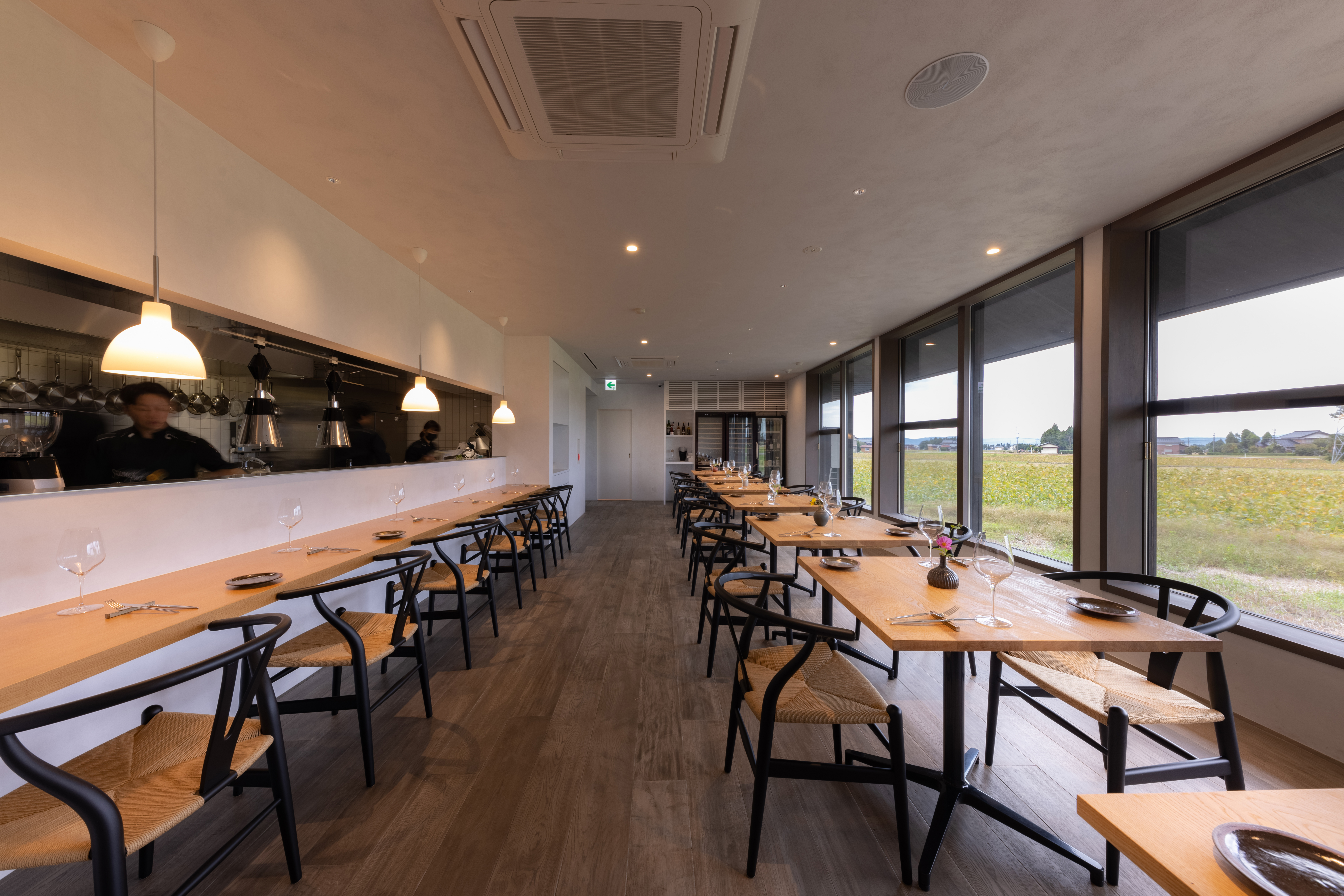 富山・北陸の食材を生かした「郷味(きょうみ)和食」は、和食の技を基に、派手さではなく土地ならではの旨みを引き出し、織りあげる現代の郷土料理です。素材から採り出した調味料を使い、縄文の時代から受け継ぐ土壌で育ったエネルギー溢れる野菜料理は、屋敷林の木々を再活用した薫香漂う火入れによって仕上げます。楽土庵は美しい農村景観「散居村」の地で、築120年のアズマダチを改修した宿泊棟と、新築のレストラン・ショップ棟で構成されたホテルです。
