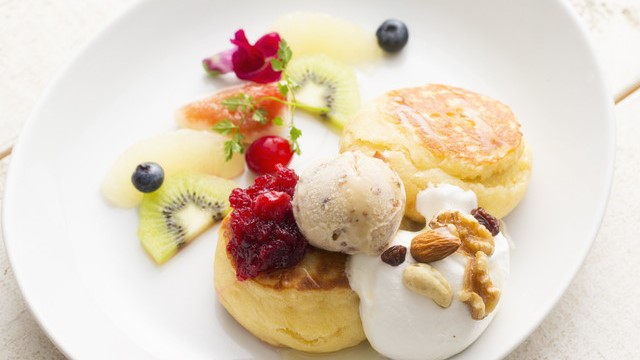 緑が茂る大きな窓から自然光が差し込む店内には、木のぬくもりが感じられる空間が広がります。白と木を基調にした店内では、アンティークの家具やモロッコから直接取り寄せた食器などもお楽しみいただけます。完全採食を提供する当店では、香り豊かなスパイスやハーブを使った季節野菜をご用意しています。植物由来のシロップやてんさい糖で甘みを出した天上のヴィーガンパンケーキは、少量のトッピングで満足感のある一品です。
