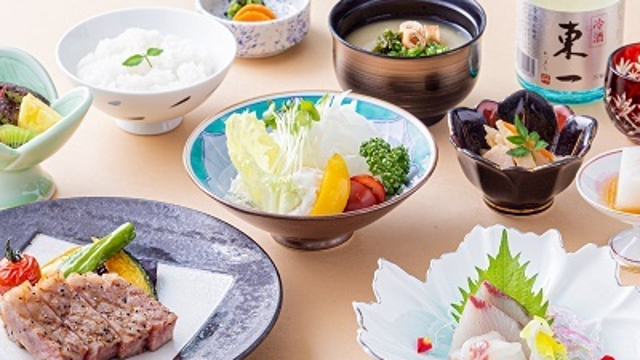 開放感あふれる窓一面に広がるのは落ち着きと品格溢れる日本庭園。四季の移ろいを感じながら味わう日本料理は、旬の素材を生かした極上の味わいに満ちています。有明海のみで生息している「わらすぼ」や「むつごろう」など地元佐賀ならではの味わいを満喫できるのも魅力です。人気の佐賀牛ステーキは、絶妙の焼き加減で素材そのもののうまみを存分に堪能していただけます。熟練の料理人が丹精込めて作った逸品料理の数々を、洗練された優雅な空間で佐賀酒と共にお楽しみください。