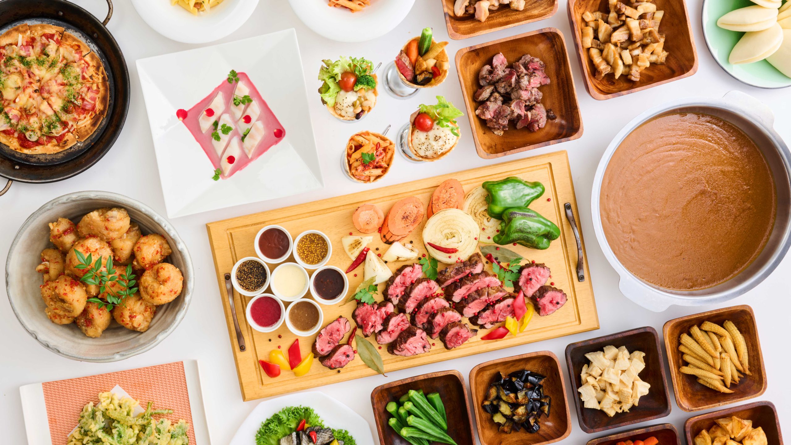店内にある大きな窓からは沖縄の東海岸が広がるレストラン。明るい空間の中で景色を楽しみながら、ランチ、ディナー共にバイキング形式で多彩な料理を味わえます。ランチタイムでは洋食や中華、スイーツなどのメニューを豊富に用意しており、ディナータイムでは夜景や夜の海などの風景が見所。朝食では東海岸から昇る朝日を眺めながら、焼きたてパンや地元沖縄の料理をお楽しみください。