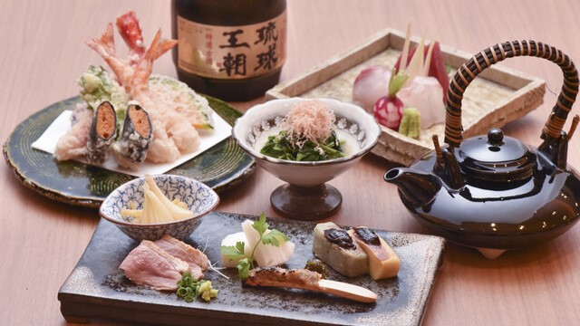 店内は大きな窓を使用し明るく開放的な空間となっています。沖縄料理を堪能したいお客様には、ラフテーや宮古牛のステーキ、宮古島産の獲れたて新鮮な魚介は刺身や天ぷらなどでご用意。シメは地産のそば粉を使用した【自家製手打ち蕎麦】はいかがでしょうか。お飲み物は、泡盛はもちろん、各種サワー、麦・芋焼酎、ウイスキーなど多数ご用意。デザートも紅芋まんじゅうや紅芋アイスなど充実しています。日本酒は“リゾート1”の品揃えとなり常時30種以上をご用意。南国気分を満喫しながら和食をお楽しみください。
