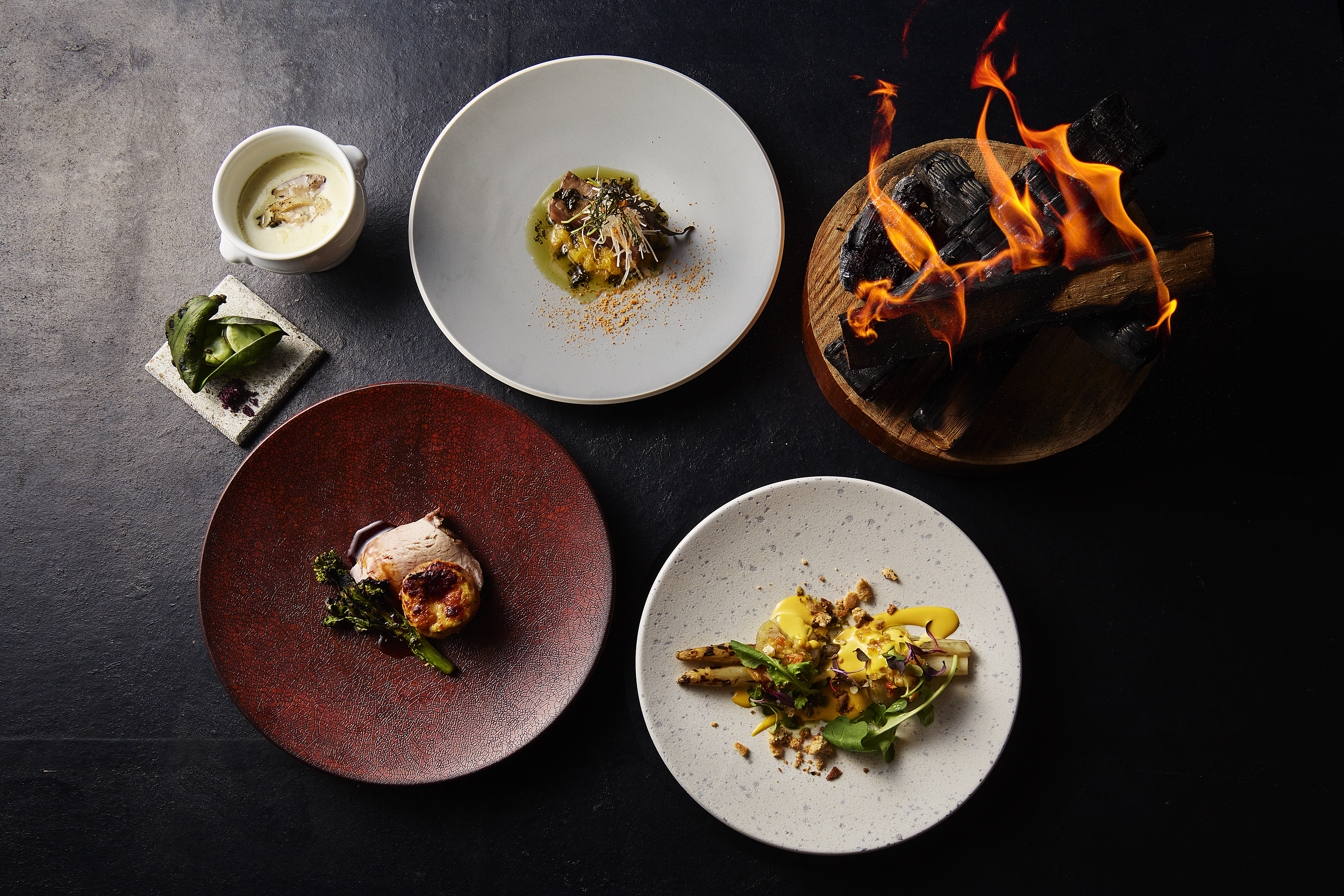近隣の旬の食材を中心に、薪火料理でダイナミックに