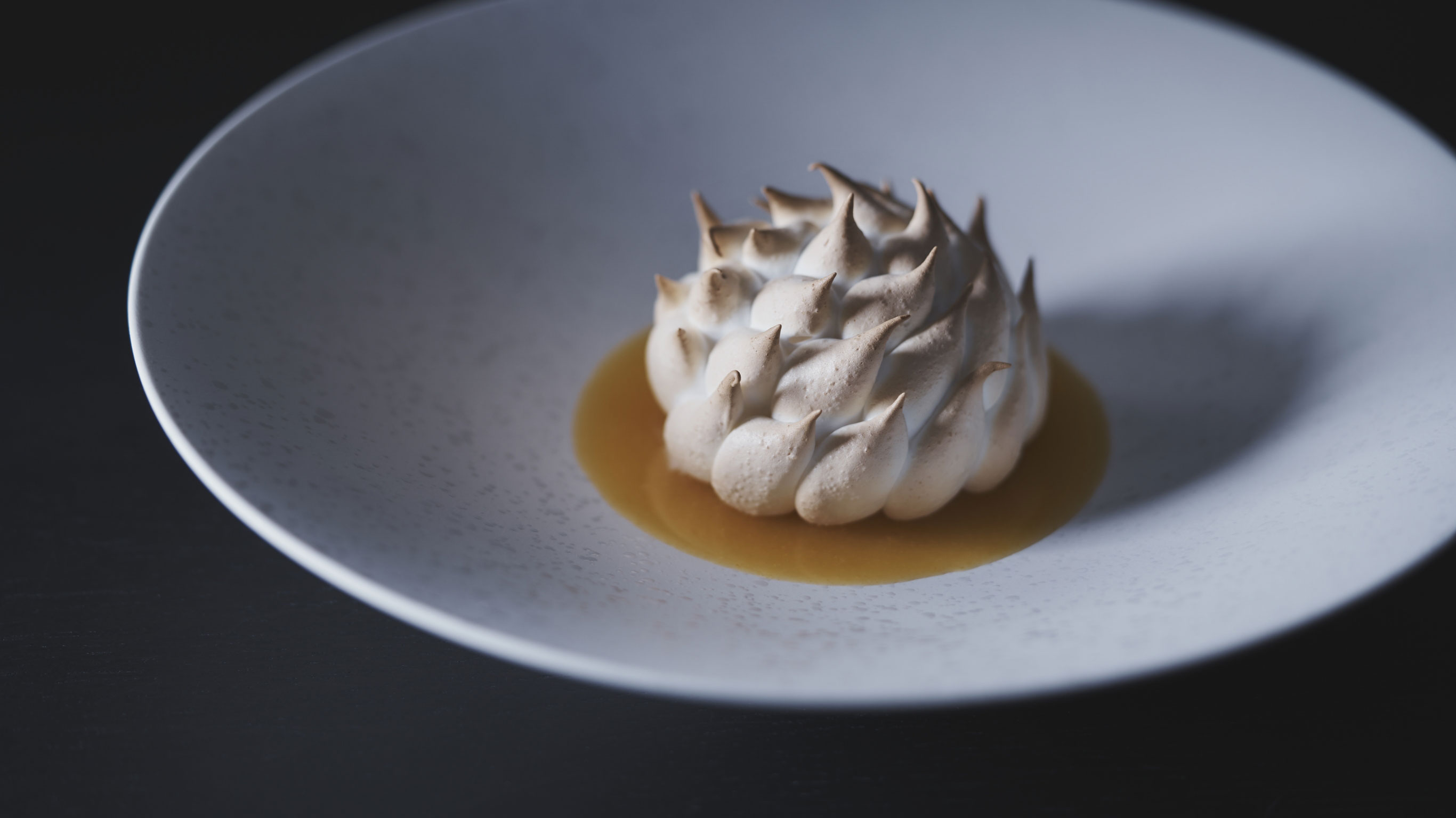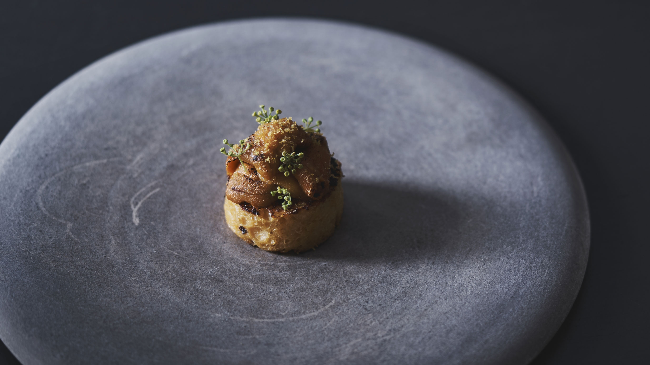 モダンでクリーンなカウンター。モノトーンでまとめたシンプルな空間。唯一の華やぎが、次々と皿の上に表現される料理です。星付きレストランのシェフ経験と料理動画のYouTuberという2つの顔を持つ異色のシェフ、吉田能。レストランならではの艶やかさにどこか居心地のいいインテリアを思わせる、そんな料理が信条です。