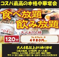 厳選した食材を本場・中国の料理人が一品ずつ真心を込めてお作りする本格中華です。 ◆飲み放題付宴会コース◆ ・4,000円コース(全9品) ・4,500円福コース(全9品) ・5,000円吉コース(全9品) ◆宴会料理コース◆ ・3,800円コース(全8品) ・5,500円コース(全9品) ・9,800円コース(全9品) ※120分飲み放題は1650円/人でお付けできます。 ※上記宴会コースは季節により変更が御座いますのでお気軽にお問い合わせ下さい。 ◇お席情報◇ ・20名様の完全円卓個室・26名テーブル個室・ ※宴会は着席で最大60名様まで対応。貸切宴会、パーティご対応可能! ※お気軽にご相談下さい。 ◆ランチ◆ 11:30~14:00までランチ営業しております。 ※ランチ内容は日替わり・週替わりでご用意。
