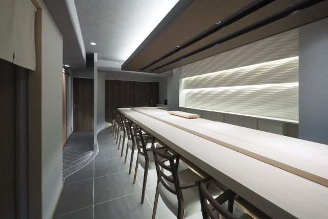 カウンター、壁面には和紙を使用し落ち着いたモダンな装いの店内。厳選した日本酒、焼酎、ワインと様々なお飲み物をオンリストしております。