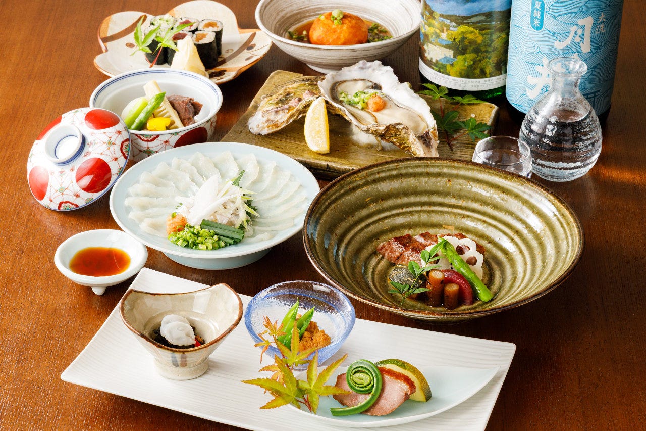 ■歓送迎会のご予約も承っております■ ※日曜日のご予約に関しては、お電話でお問い合わせください。 ◆厳選素材を使用した料理の数々 素材の良さを存分に引き出すため、調味料もひとつひとつ調合。 茨城県が誇る常陸牛を使用したメニューをはじめ 地元市場で目利きした食材を丁寧に調理します。 是非お召し上がりいただきたいフグ料理はご予約に合わせて手配いたします。 ご希望の際は事前にお知らせくださいませ。 ※日本語を話せない方のご来店はお断りしております ◆お食事を彩る豊富な日本酒 関東で随一の酒蔵量を保持する茨城県。 中でも特に良質な味わいの五大水系のお酒を一種類ずつ取り揃え。 酒屋と提携して定期的に銘柄を入れ替えているため、 何度お越しいただいてもご満足いただけます。