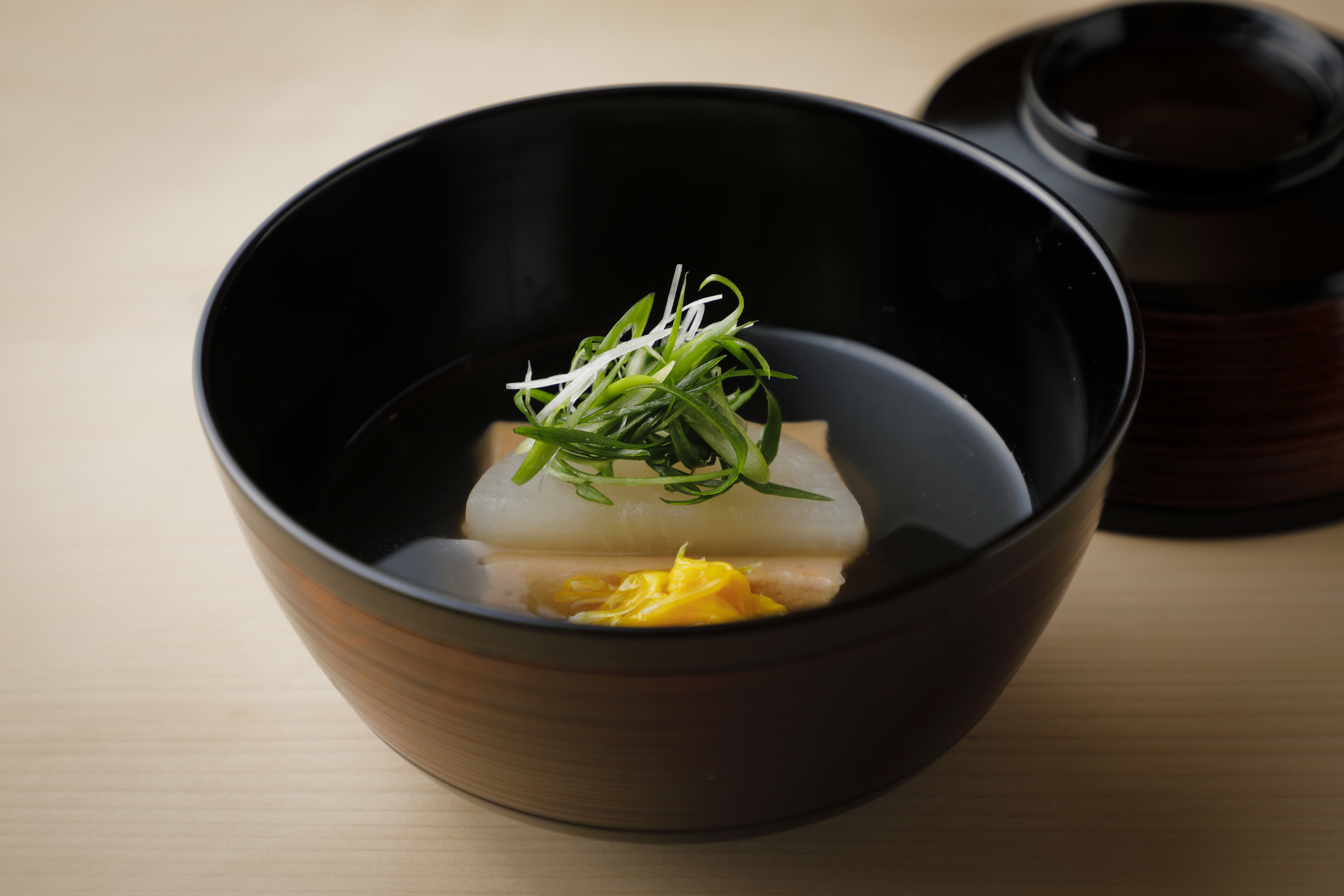 『八寸』の中、控え目に置かれた「丹波篠山産黒豆蜜煮」で料理人の料理に対する姿勢が分かります。【下鴨福助】では、12月中旬の丹波篠山産2Lの黒豆のみを使用。表皮に皺が寄らず破れず、ふっくらとした甘さの黒豆は、まさに黒曜石のような輝きを放つ極上の逸品。現在の三代目は包丁や砥石に対する造詣が深く「きれいな仕事」にこだわります。例えば、吸い物の中の具材。出汁を通して見える具材の断面を美しさ、口当たりの良さを追求します。料理に合う日本酒としては純米酒を揃え、出汁と相乗する一本を仕入れています。ここは、接待や商談、顔合わせなど縁を大切にしたい人たちの宴席にふさわしい一皿を生みだす料亭です。