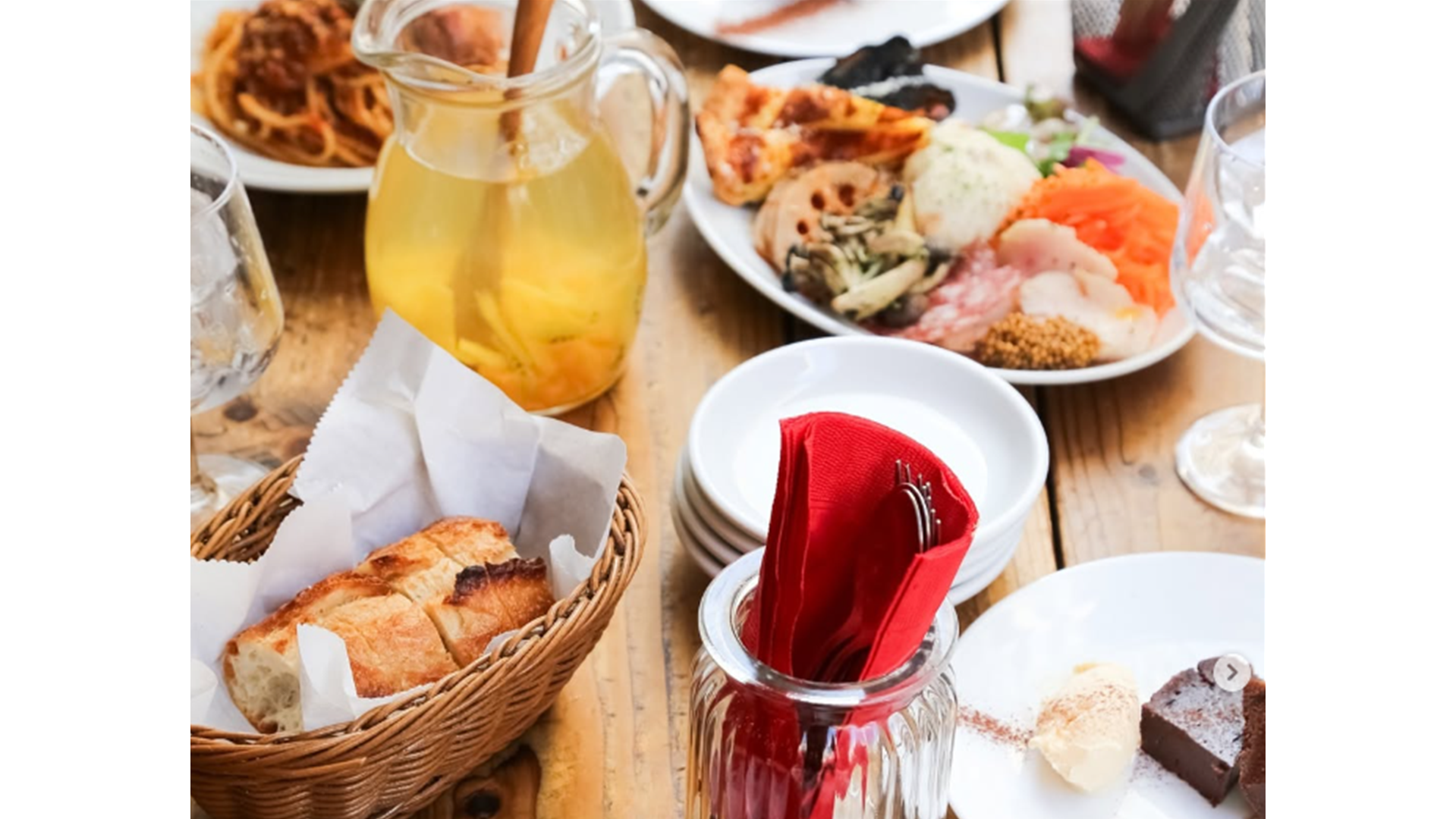 ◆《4/1~5/31まで「海と山のSpring Selection」開催》 天然ハマグリや藁焼きカツオ等、春の恵みを楽しめる期間限定メニューが登場。 ◆2025年10月店内リニューアル! より広々と落ち着いた空間へ生まれ変わりました。 ◆本格イタリアンをテーブルオーダーバイキングで堪能! 焼きたてピッツァや茹でたてパスタ、前菜からデザートまで出来たてをお届け。 アラカルト全メニューOK! お好きなものを心ゆくまでお楽しみください。 ◆ランチタイムは絶品パスタセットをご用意! パスタに追加でオーダーいただくと、サラダ・デザート・ドリンクなどがついてくるお得なセットメニューがおすすめ◎ お好きなパスタと組み合わせてみてくださいね!