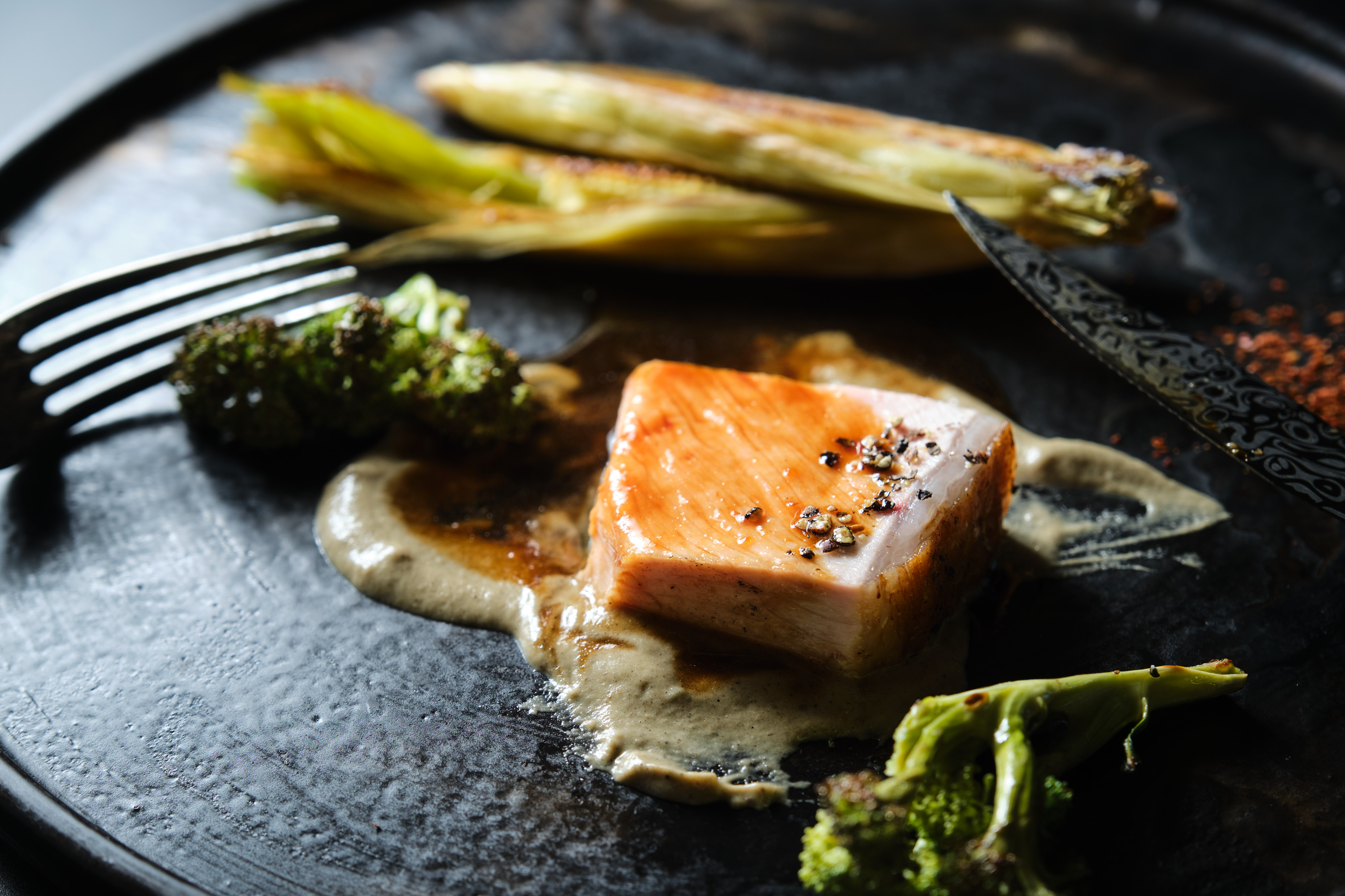 王道のフレンチをベースに和の要素を取り入れた、個性の光るフュージョン料理が楽しめる【レストラン ル・ジャポン】。ガラス張りの扉を開けると、開放的な空間が迎えてくれます。ここで味わうのは、静岡産の農園野菜や鮮度にこだわって仕入れた食材でつくる料理の数々。和牛イチボのロティや農園野菜と提供する『チーズフォンデュ』は、4種のチーズにコンソメを合わせ、葛粉でとろみをつけた自慢の一品です。他にも酒粕や白味噌、柚子胡椒を用いるなど、和の要素を散りばめてコースを構成します。日本料理店で修業を積み、基礎を学んでいるからこその絶妙なバランス。違和感なく融合した和洋折衷の料理が楽しめる、行きつけにしたいお店です。