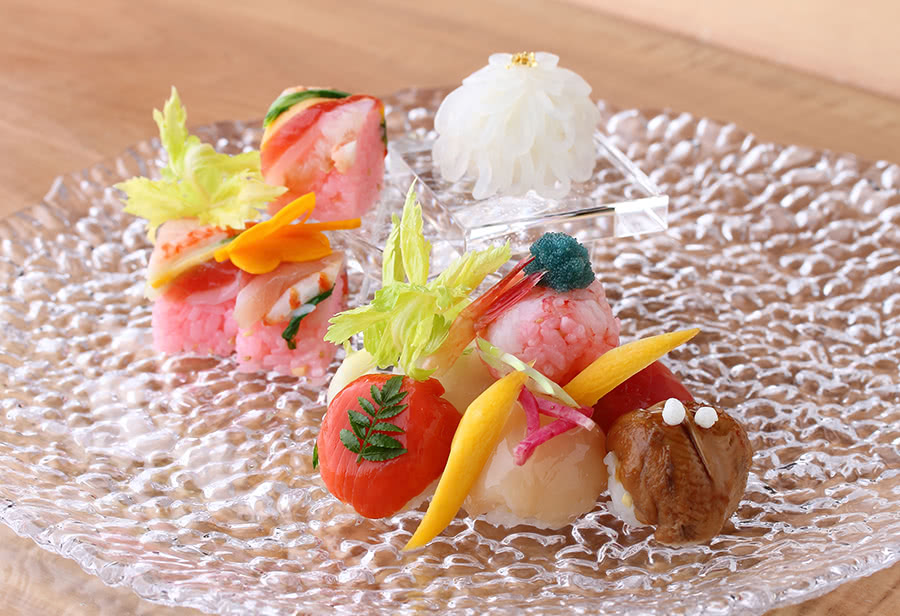 細工の施されたガラス皿の上には、マグロ、小松菜、錦糸卵などの具材を揃えてカットし、酢飯とともに巻きあげる「手綱寿司」。ガラス板の最上段に置かれているのは、菊を模したイカに金粉をあしらった「菊花寿司」だ。他にも、サーモン、甘海老、ホタテ、穴子など数種の手まり寿司が、「五色」の作法に習って春の花畑のように並んでいる。そして、寿司だけでなく、沖縄の島にんじんで作られたちょうちょ南京や、唐草大根の葉で作られた美しいあしらいが、皿に季節感を添え、新たな彩りをプラスしているのだ。