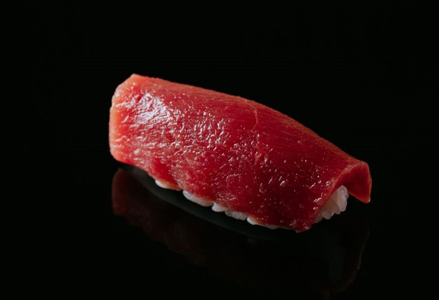 赤身は鮪の中でも夏は爽やかな酸味、冬は甘みやコクが深まるなど季節による味わいの違いを楽しめる部位。その個性が際立つよう一瞬漬け醤油につけてから握る