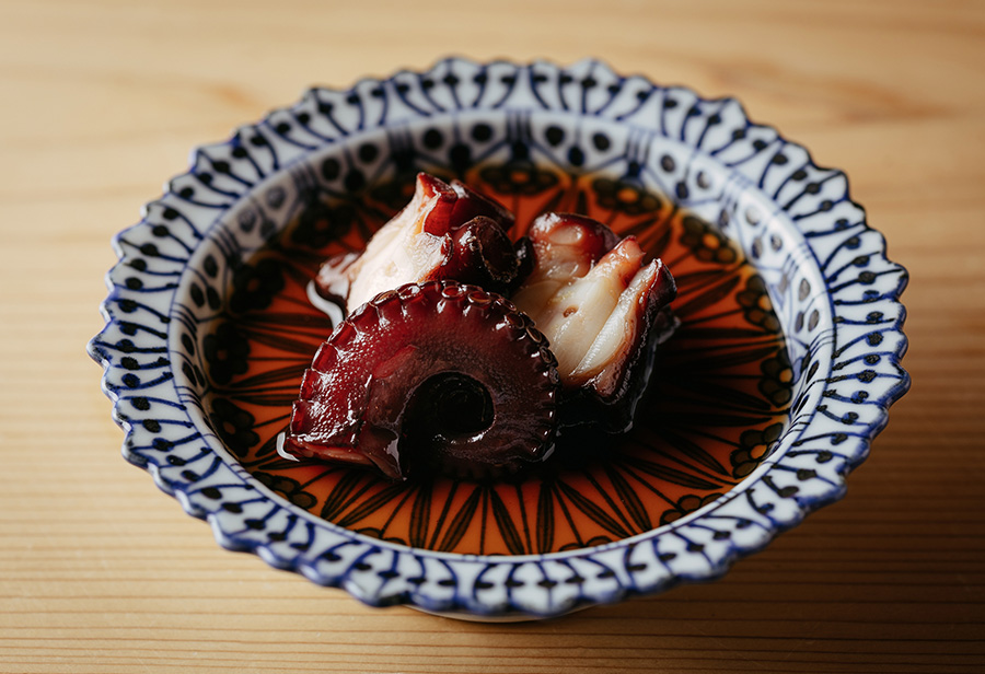 足の真ん中や皮と身の間にあるゼラチン質を残しながらやわらかく仕上げるために、10年近く試行錯誤した『蛸のやわらか煮』。【鮨さいとう】を代表するおつまみとして愛されている
