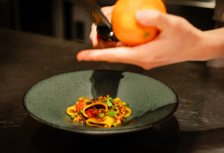和歌山県のふなき農園が手掛ける艶やかなフルーツトマトを使ったソースに、手打ちのタヤリンを投入