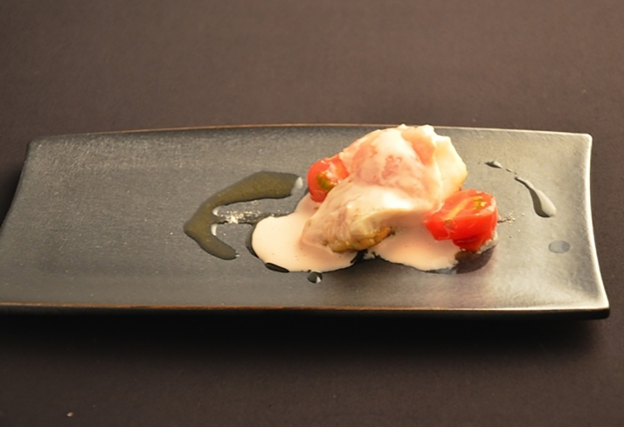 テーマは「森」。鳥の巣をイメージした器の中には削ったペコリーノロマーノチーズとクリーム。その上に白トリュフのオイルと空気が注入された茹で卵が置かれている。スプーンを入れると中に入れた空気が反応して「パン」と弾け、白トリュフの香りが一面に広がる。流れ出す黄身を白身やチーズ、クリームと一緒によく混ぜ合わせていただく。カルボナーラをパスタと捉えるなら別物だが、卵料理と捉えれば、それに欠かせない食材がまんべんなく使われたこの料理は、まさに81流のカルボナーラと言える。