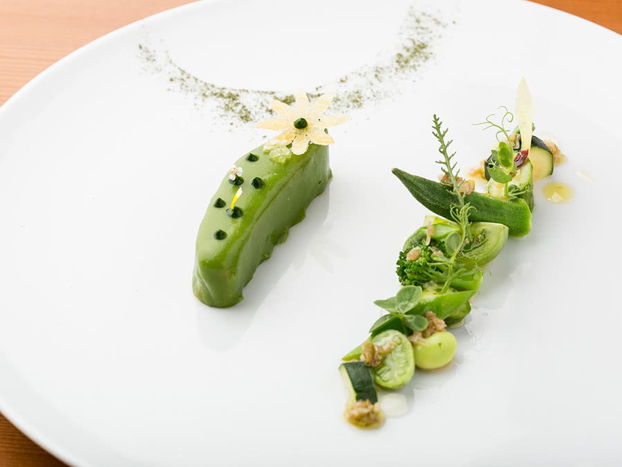 はい。ここは奈良ではありませんから。東京で奈良をどう感じさせたらいいのだろう、というのは一階に入っている物販「リブレ」の方ともよく話すんです。でも、普通に“じゃあ、奈良らしさってなに?”って自問自答してもはっきりとした正解がでてこない。もう少しここが成長していったら、メニューに和紙を使うとか、しつらいを考えるとか、もっといろんなことができると思いますが、今は欲張らずにテーブルの上で奈良県を感じる”エッセンス”を作れればいいかなと思っています。料理の食材はもちろん、話題にあがっている奈良の日本酒をメニューに出したり、素麺を料理に使ったり。でも、僕が作るのはフランス料理ですから、奈良らしい食材を使った上で、フランス料理ならではの香りの組み合わせを大切にして料理を作っています。
