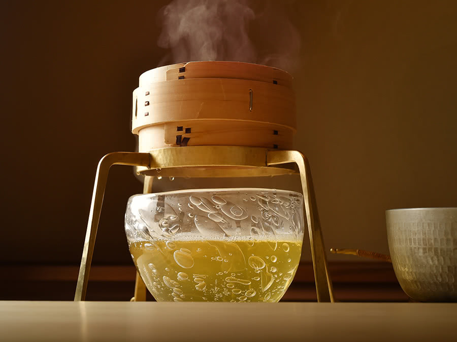 だしをつくる水の味をまず知ってほしいと思い、お出ししています。お席に着かれて、ほっと一息ついてもらうのに、うちのすべてのお料理の基本になっている井戸水でまず口を潤していただく。コースの“メイン”は椀物ですから、そこへの流れというのはやはり考えました。たとえば、コースは飯蒸しから始まり、小吸い物に続くのですが、小吸い物はメインの椀物のだしとは違うもの、つまり“昆布と鰹のだし”以外のものでつくるようにしています。すっぽんや、ハマグリや鮑などの貝のおだしなどを使ったものですね。違う旨みをもってくることでメインの椀ものとの違いを感じてほしいんです。