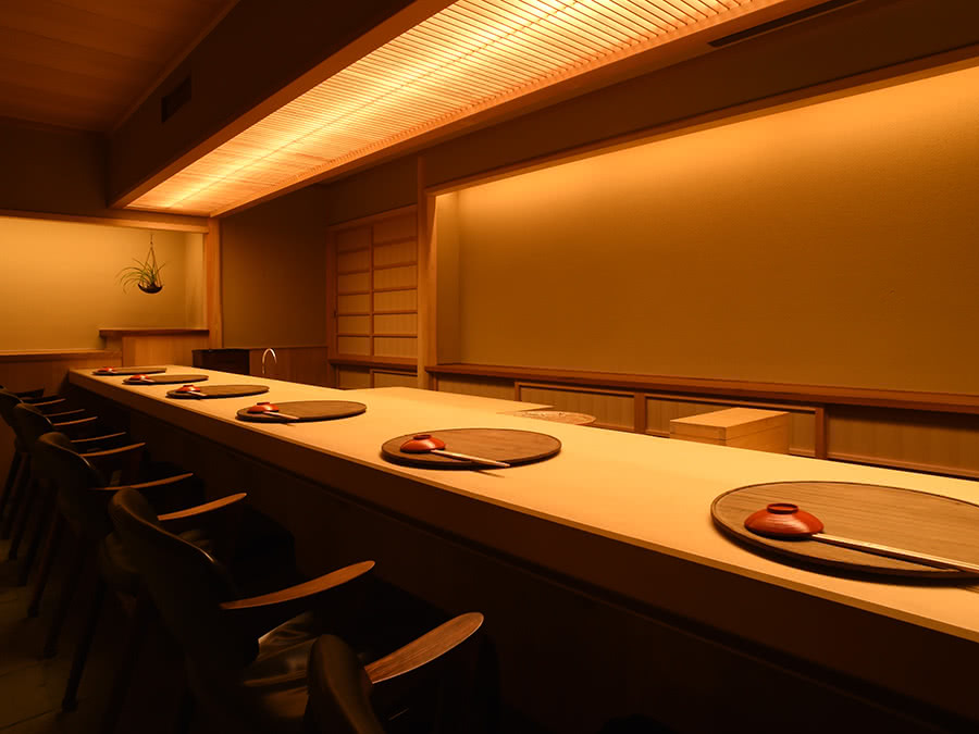 「カッカッカッ」と目の前で削られる鰹節の音に思わず引き込まれる。美しいガラスの作家もののボウルに、黄金色のだしが注がれると客席中にふわっといい香りが広がった。日本の食文化の基本となる“だし”をゲストに印象づけたコースは日本人のDNAに響き、訪れる人々を魅了してやまない。開店後1年経たずにミシュランの星を取り、予約困難店となった名店の料理人に取材した。