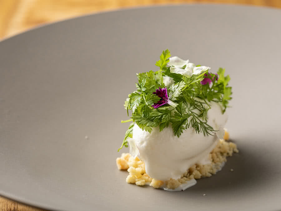それも、お客様に楽しく過ごしてもらいたいという気持ちからだと思います。来店してから家に着くまでの間、ずーっと満足した気持ちのまま帰ってもらいたいんです。例えば、お客様が今日の料理に物足りなさを感じて、帰り道にコンビニ寄って何か食べちゃう、なんてのは嫌なんです。だから、デセールで出しているアイスには「最後に最高においしいアイスを食べて、大満足して帰ってもらいたい」という思いを込めています。それから、お店での時間をどうストレスなく過ごしてもらうかも大事。食べ疲れしないように、例えば、濃厚なアイスにハーブをあわせることで、あっさりとしつこくなく食べられるようにしています。「家に帰ったら気持ちいいまま寝れます」というのをやりたいんです。