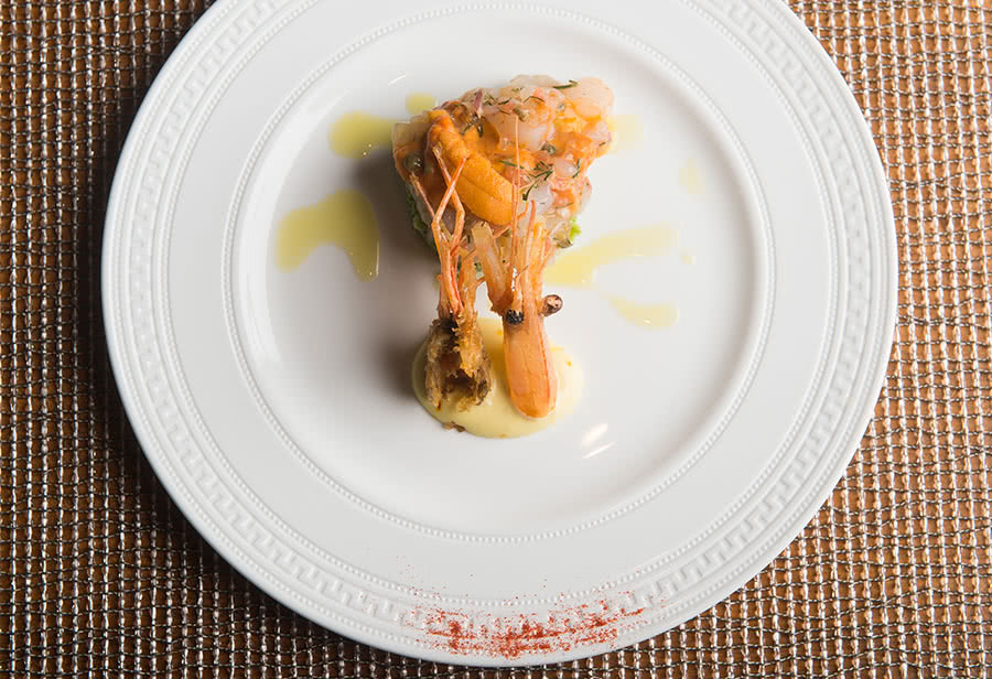 『ボタンエビとウニのタルタル アイオリソース』。ブロッコリーのクレームの上にのったボタンエビは、茹でたての温かなブロッコリーの温度で甘味が増す