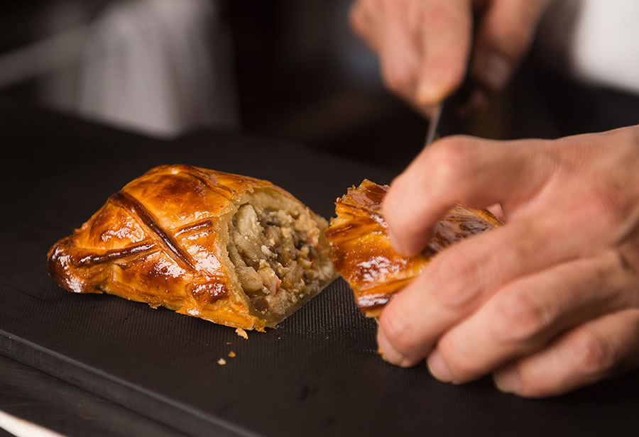 パイ包みの中から、蟹とスクランブルエッグが顔を見せる。「カットした瞬間に香りが立つので、お客様に感じてもらえるようカウンターで切っています」