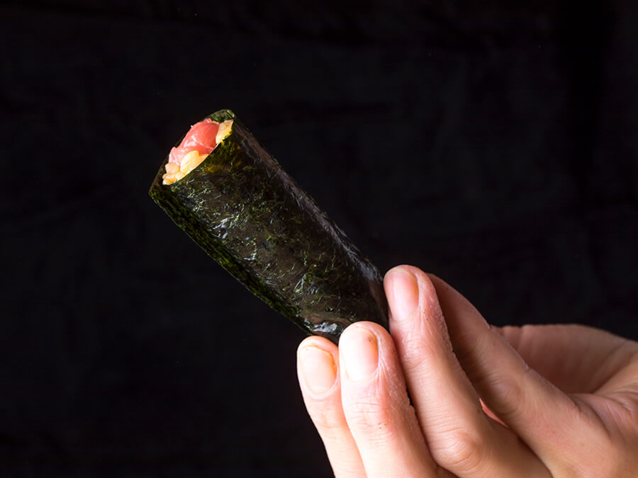1匹のマグロからわずかしか取れない頭の付け根部分を、赤酢のシャリと有明産の海苔で巻いた『突先』。佐藤氏の名刺代わりとなる一品。