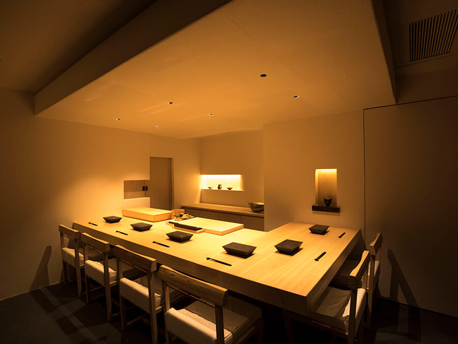 フレンチのグランメゾンを訪ねると、料理はもちろん、空間やサービスに至るまで細やかな配慮が行き届いているのを感じます。一方、僕らがいる鮨の世界はどうか。まだまだです。ほぼ、カウンターですべてが完結してしまっている。それを否定する気はありませんが、僕なら、お鮨を楽しんでいただくと同時に、優雅な時間を提供したいと思うんです。サービスマン出身ならではの発想かもしれません。それで、まずはとウェイティングスペースを設けました。