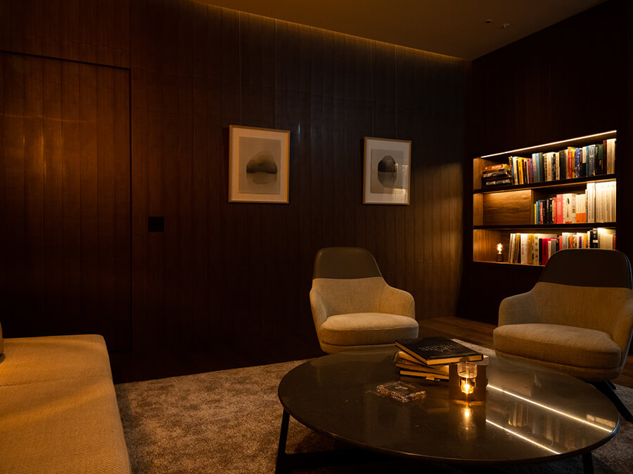 シックな雰囲気のウェイティングスペース。その壁の向こうには思いがけず明るいダイニングが広がり、案内されるとゲストは意表を突かれることになる。