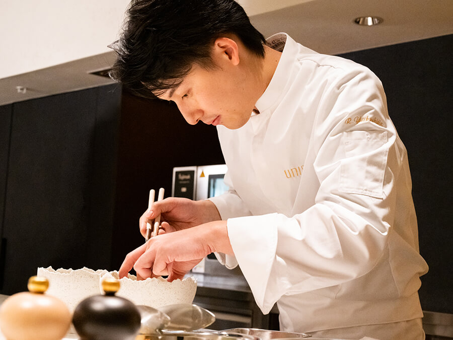 僕はお客さまの大切な日を演出する料理人でありたい。料理をつくる者として幸せを感じるためには、自分が想っていることをきちんと言葉に出してお客様に伝えることが大切なのではないかと思っています。だから、【unis】ではそうした考え方をご理解いただいたうえでご予約をいただくようにしています。もちろん、“ハレの日のため”と謳うからには、お料理はもちろん、空間にも工夫を凝らし、記憶に残るひとときを精一杯、誠実に演出するつもりです。