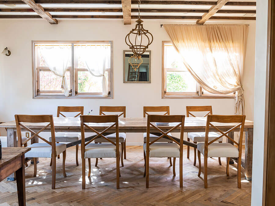 昼は自然光で十分明るく、室内にいるのに、どことなく外の空気や香りを感じられる気持ちのいい空間に、テーブルを置く