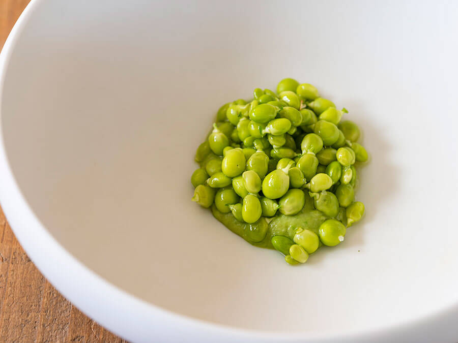 『涙豆』。バスク地方で親しまれている豆料理を、ツタンカーメンやスナップえんどうなど計4種の品種で。豆本来のみずみずしさと、レモンが香るオリーブオイルで仕上げたピューレのなめらかな食感にワインがすすむ。