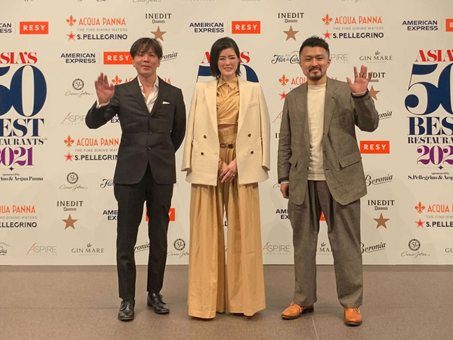 2021年3月に発表された「アジアベストレストラン50」のバーチャル授賞式。左から【ヴィラ・アイーダ】小林寛司シェフ、【エテ】庄司夏子シェフ、【チェンチ】坂本健シェフ