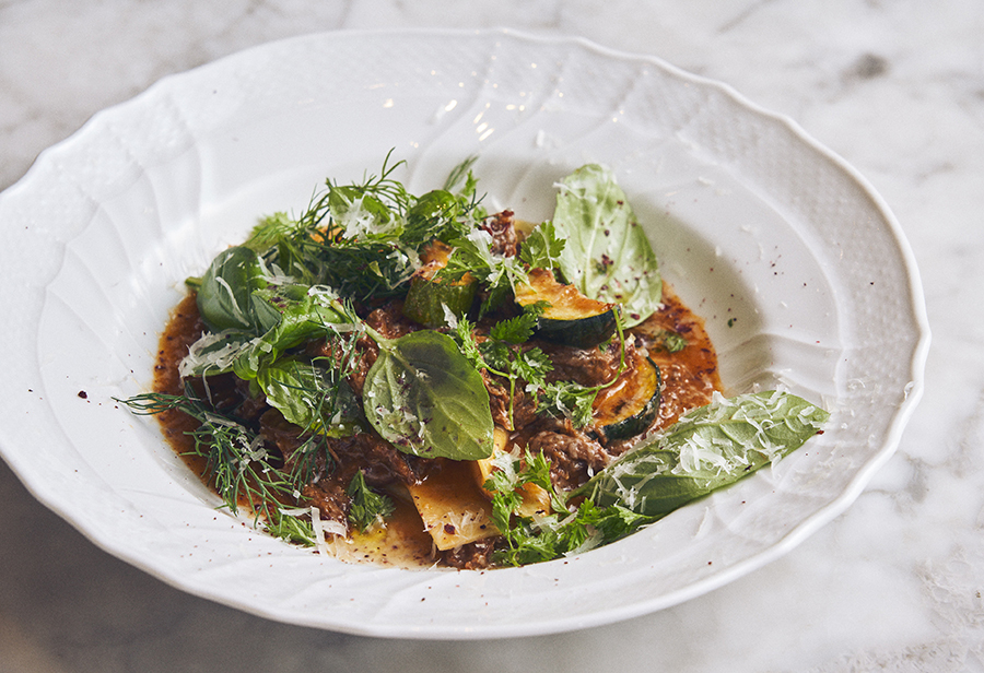 『夏鹿のラグーナポレターナ パッパルデッレ』。ナポリの郷土料理「ラグー」を壱岐の夏鹿でつくり、たっぷりのハーブと。パスタは手打ちのパッパルデッレ