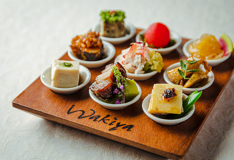 日本料理の八寸さながらに、五味・五色・五法のバランスよく、季節の食材を使った『九つの喜び前菜』。