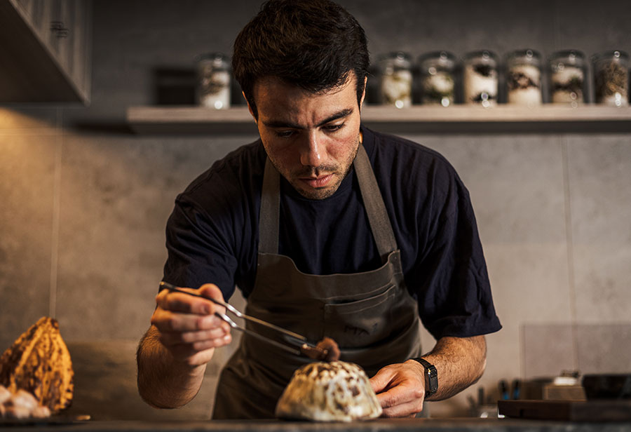 種類や形状、状態も様々なカカオ。「捨てられていた外皮や薄皮も、調理技術でおいしくできる。食材のすべてを感じてほしい」