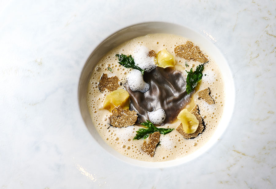 シャテーニュ栗のカプチーノ仕立て』は、心から尊敬する二人の巨匠へのシグネチャーを一皿に。吉野シェフの『シャテーヌ栗のポタージュ』に、井上シェフの『ラヴィオリとトリュフ