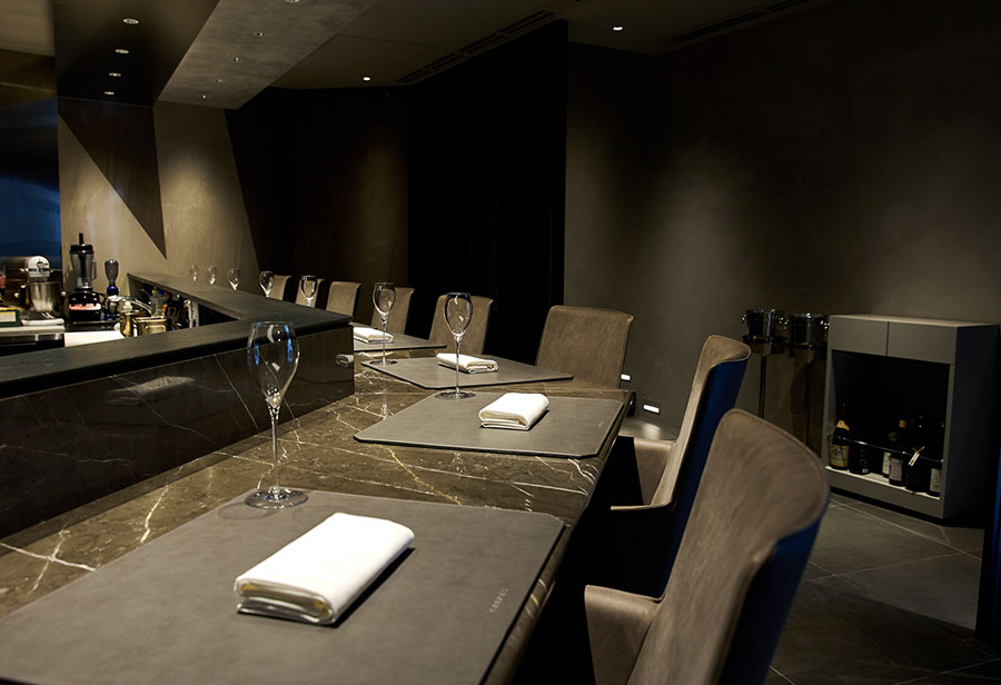 グレーを基調とした落ち着いた内装、端正に並ぶロブマイヤーのグラスが、特別な夜を約束してくれる。