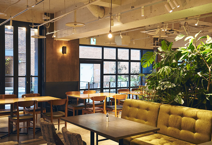 カリフォルニアの明るい空気感が漂う、緑に囲まれた店内。ソファシートもあり、家族連れも気軽に楽しめる。