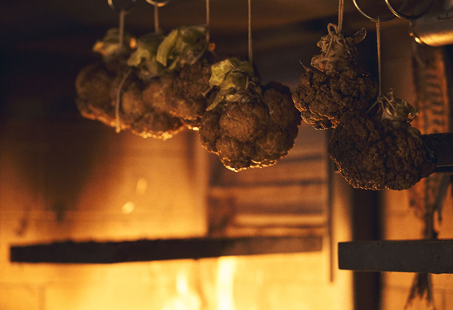 ずっと使いたかった薪火ですが、今の使い方に関しては、私は【Saison】のエグゼクティブスーシェフだった、29歳の時に習ったもので、もうこの方法を続けて6年になります。他の場所でも薪火を使用していましたが、これと全く同じ方法ではありませんでした。ジョシュア(スキーンズシェフ)のやり方は、燃えさしだけを使うのではでなく、カリフラワーは、3日間炉の上に吊るしておきますし、ワカメはバスケットに入れて火の上で乾かしたりと、囲炉裏全体を利用するのです。薪火の多様な使い方、その可能性はまさに目から鱗でした。