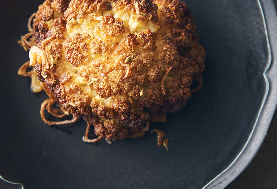 存在感抜群の『24時間炙ったカリフラワーの薪焼き』。自家製バターと薫香がカリフラワーの旨みを強調する。