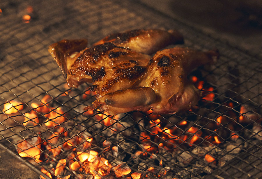 扱い次第で、200〜1200度に変化する薪火。一見シンプルなローストチキンだからこそ、その技が際立つ。