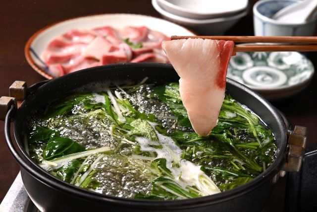 昭和6年築の木造三階建て「三宜楼」は九州最大級の歴史的建造物で、かつては料亭として営業。高さ5mの石垣が存在感を放ち、訪れる人を魅了しています。現在は【三宜楼茶寮KAITO】として繁盛し、ふぐ仲卸直営ならではの誇りある食材と職人技が光るふぐ料理を提供。名物の『ふぐ刺し』は美しく繊細な味わいの絶品で、オリジナルの『とらぶつ』も人気です。2階には「百畳間」と呼ばれる大広間があり、舞台や床の間を備え、天井や欄間に精巧な装飾が施されています。折上格天井や網代天井など、細部までこだわった意匠も特徴的。門扉から玄関へ続く石畳にも風情があり、歴史と格式を感じさせる佇まい。接待や記念日、家族の食事、宴会にも最適です。