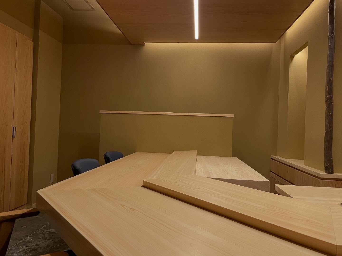 カウンターは幅広の一枚板 日本で初めて漣(さざなみ)デザインを施した天井板のもと、 料理人との一体感をお楽しみください。 この道30年の料理人の丁寧な仕事 その日仕入れた食材で瑞々しい和の 献立をえがきます。